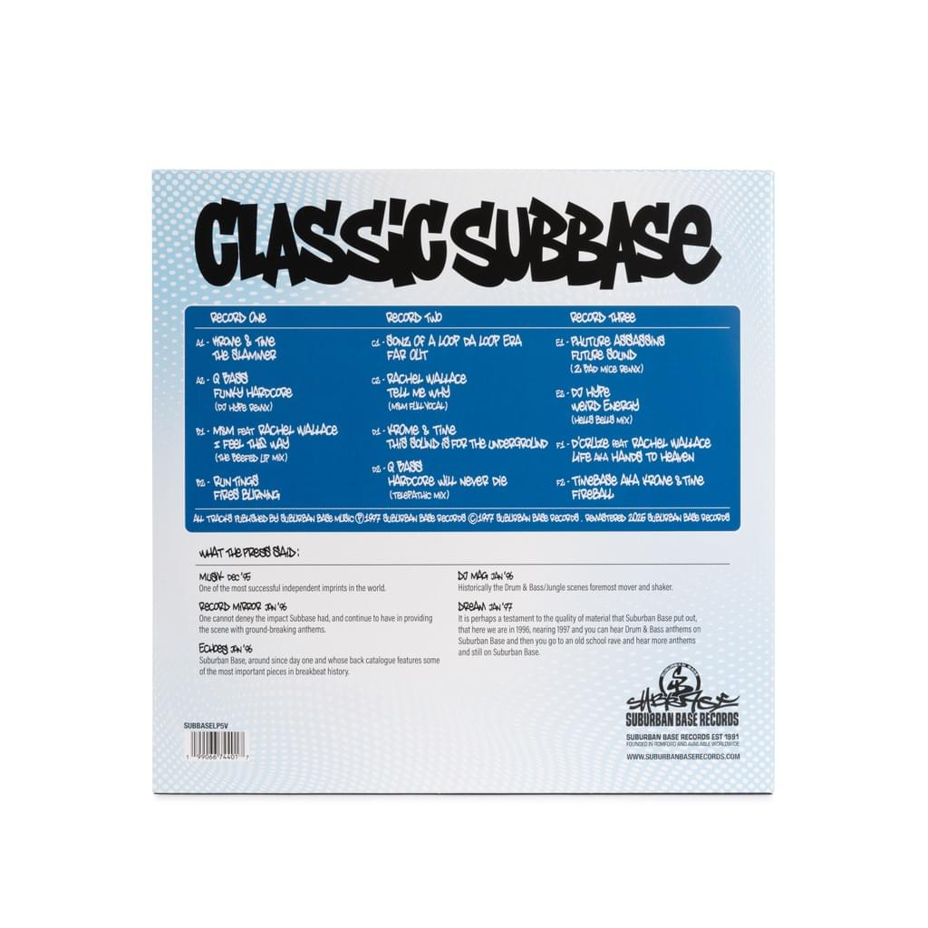 Suburban Base Records proudly unveils the vinyl reissue of the iconic 1997 album Classic Subbase, following huge demand after releasing the album digitally last December. For the first time since its original release, this legendary compilation is available on 3 x black vinyl, housed in a fully illustrated sleeve that pays homage to the original classic artwork.
